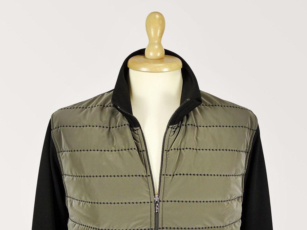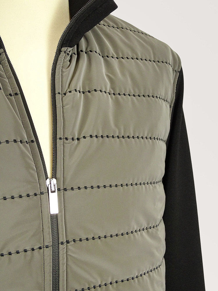 Men's long-sleeved, zip-up, mixed-yarn knit cardigan sweater with a quilted striped pattern and pockets on the front. Unique look, stand-up collar design, straight-cut top, with elasticated trim at the waist and cuffs. Perfectly fitting, excellent piece for a casual-elegant style.