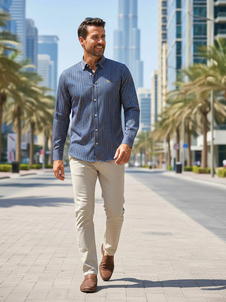 Sűrűn csíkozott, egyenes szabású hosszúujjú férfi ing cápagallérral. Az anyaga légáteresztő, amely jó szellőzést biztosít. A mellkas bal oldalán logóval ellátott. A puha, tartós anyag prémium minőségű szálakból készült és nagyon kellemes tapintású, rendkívül kényelmes érzést garantál viselés közben. Egyedülálló darab, amely mindig különleges helyet foglal majd el az elegáns és lezser stílusú ruhatárában.