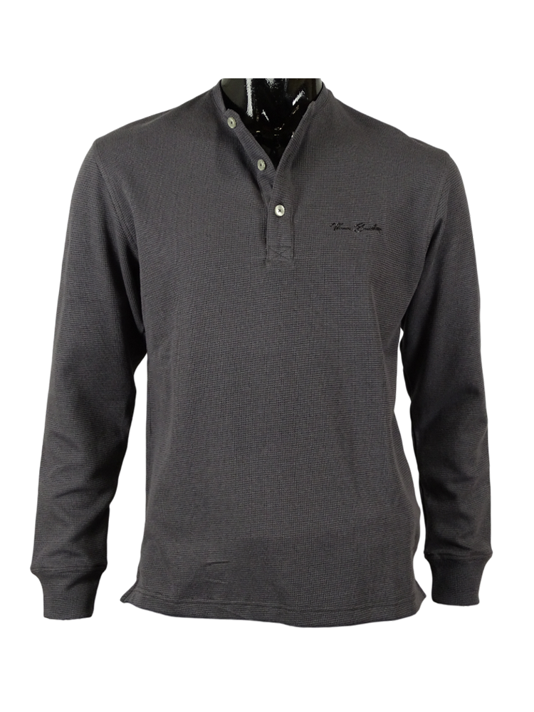 Men's long-sleeved, textured, blended cotton sweater. Relaxed-elegant look, 3-button, O-neck design. Straight-cut top with a straight fit at the waist and ribbed cuffs. Due to the fabric composition, it has excellent moisture-wicking properties and provides excellent insulation in cooler weather. A loosely fitting, understated piece for a casual style.