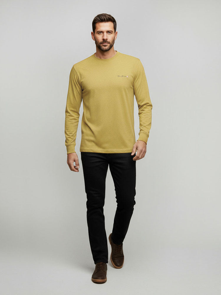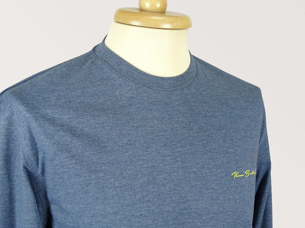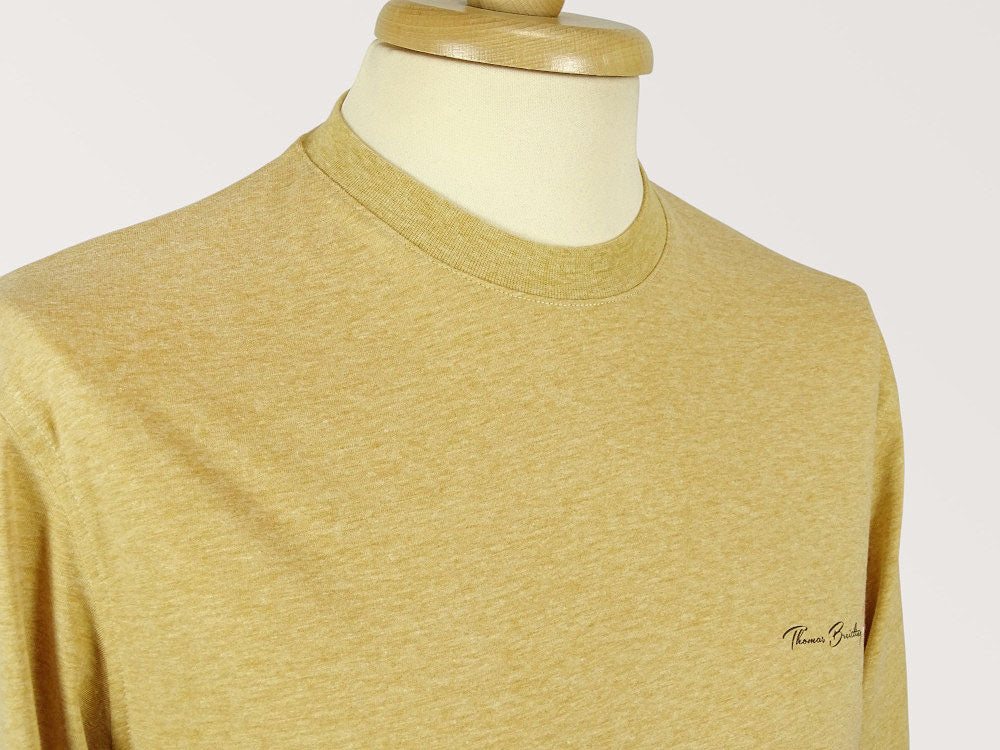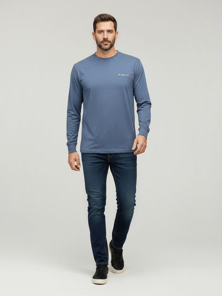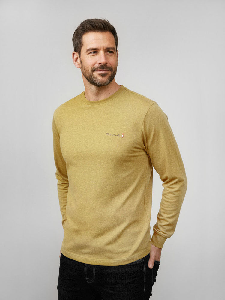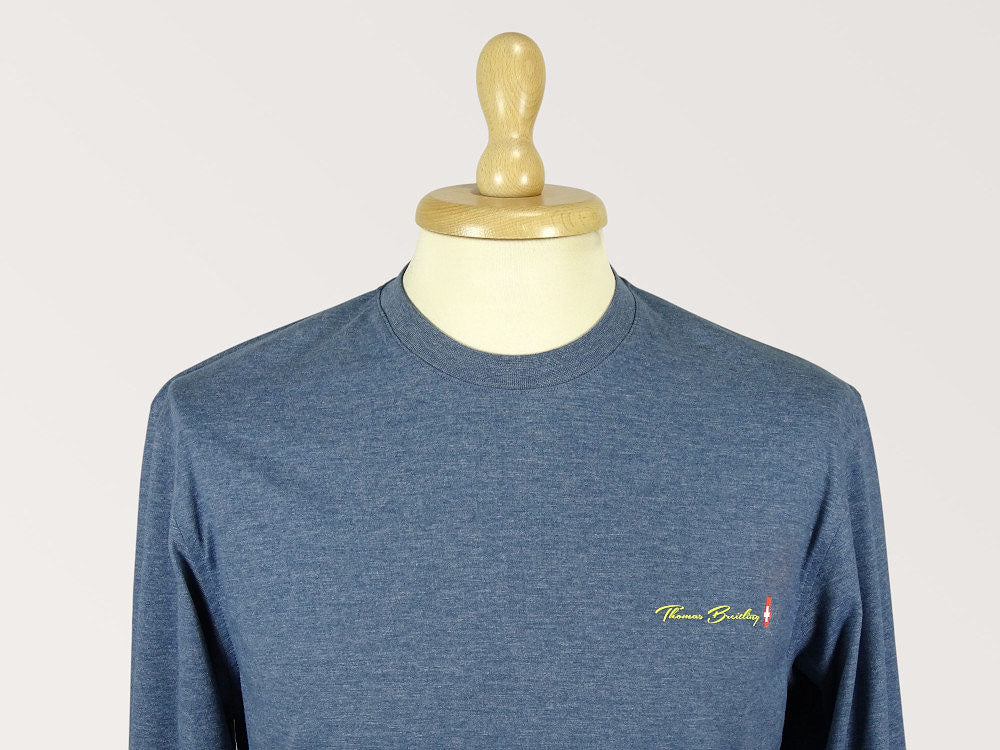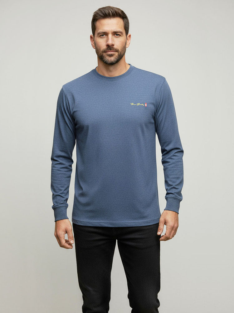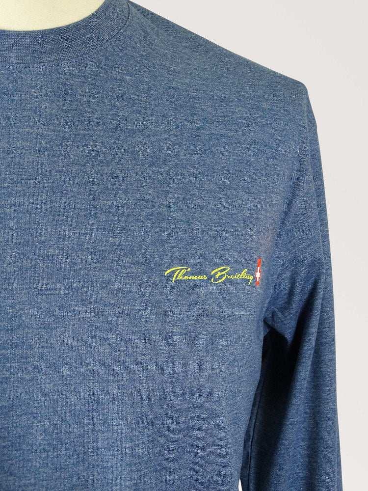 Melange solid-color crew-neck long-sleeve men's t-shirt, made from pleasantly soft, high-quality blended cotton. Features a Thomas Breitling brand logo printed on the chest, matching the t-shirt color. The premium material composition consists of high-quality fibers, guaranteeing breathability. Extremely comfortable, ideal for everyday wear, and a versatile base for a casual-elegant style. Can also be worn as an undershirt.