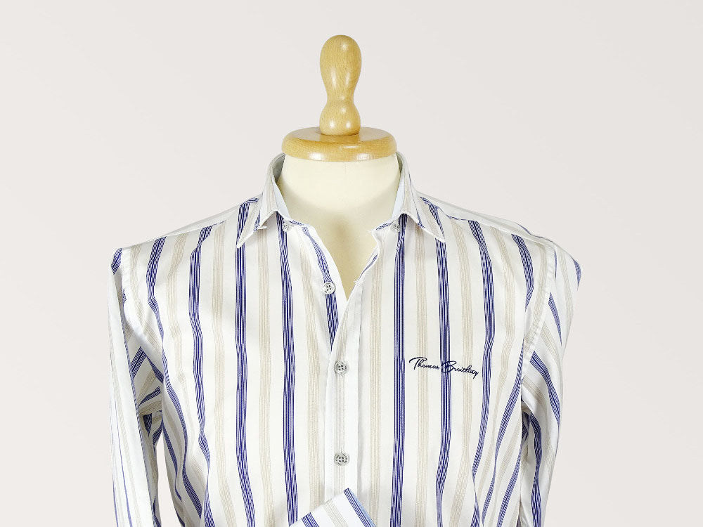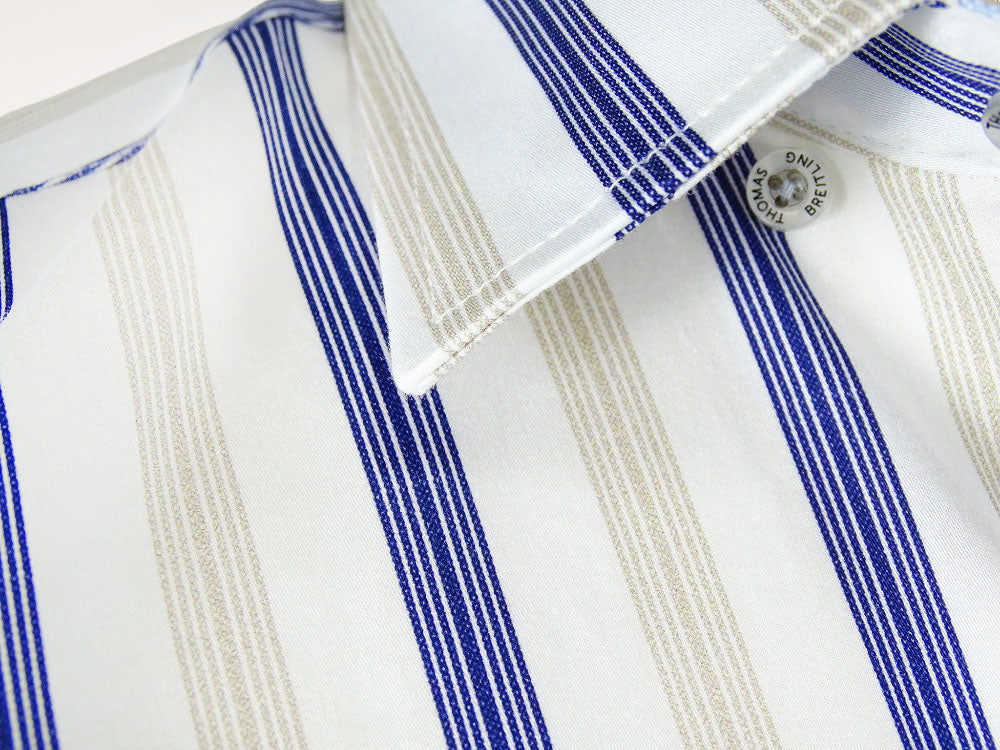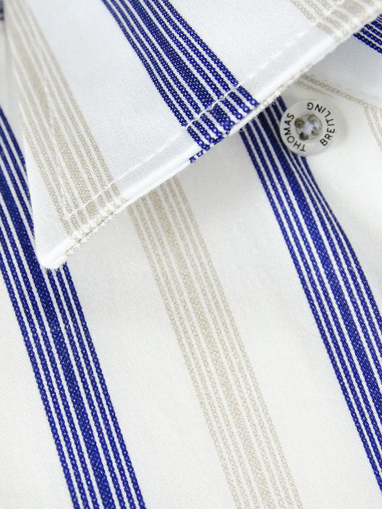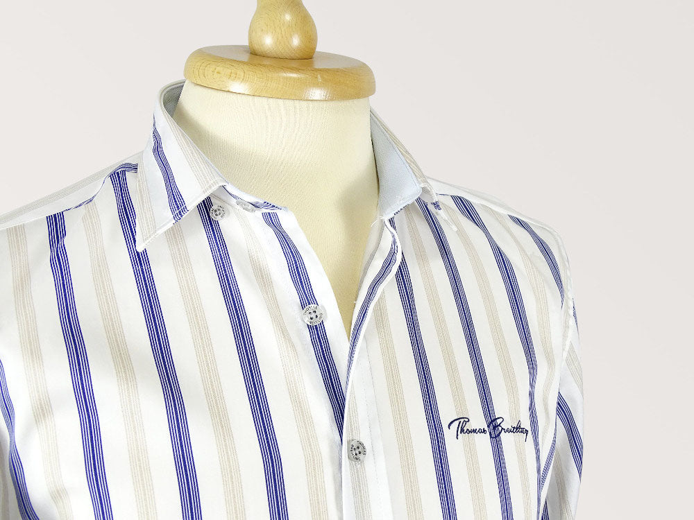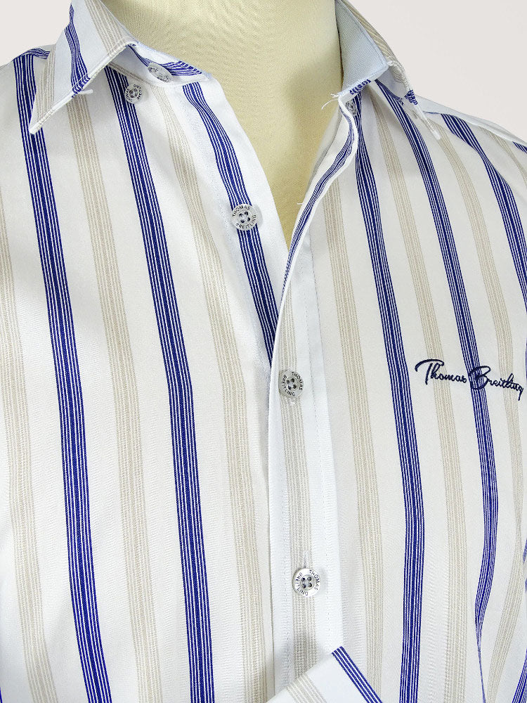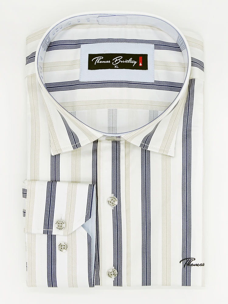 Striped men's cotton shirt with a unique pattern and contrasting inner collar. Features a button-down collar for added stability. Embroidered brand logo on the left chest. The velvety soft, durable fabric is made from high-quality cotton, offering a pleasant feel and exceptional comfort. A timeless, breathable piece that will always be a popular part of your elegant and casual style. Popular when paired with both jeans and chinos.