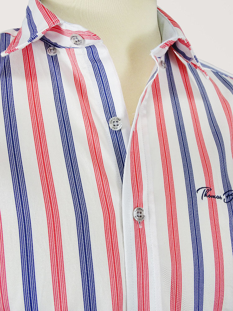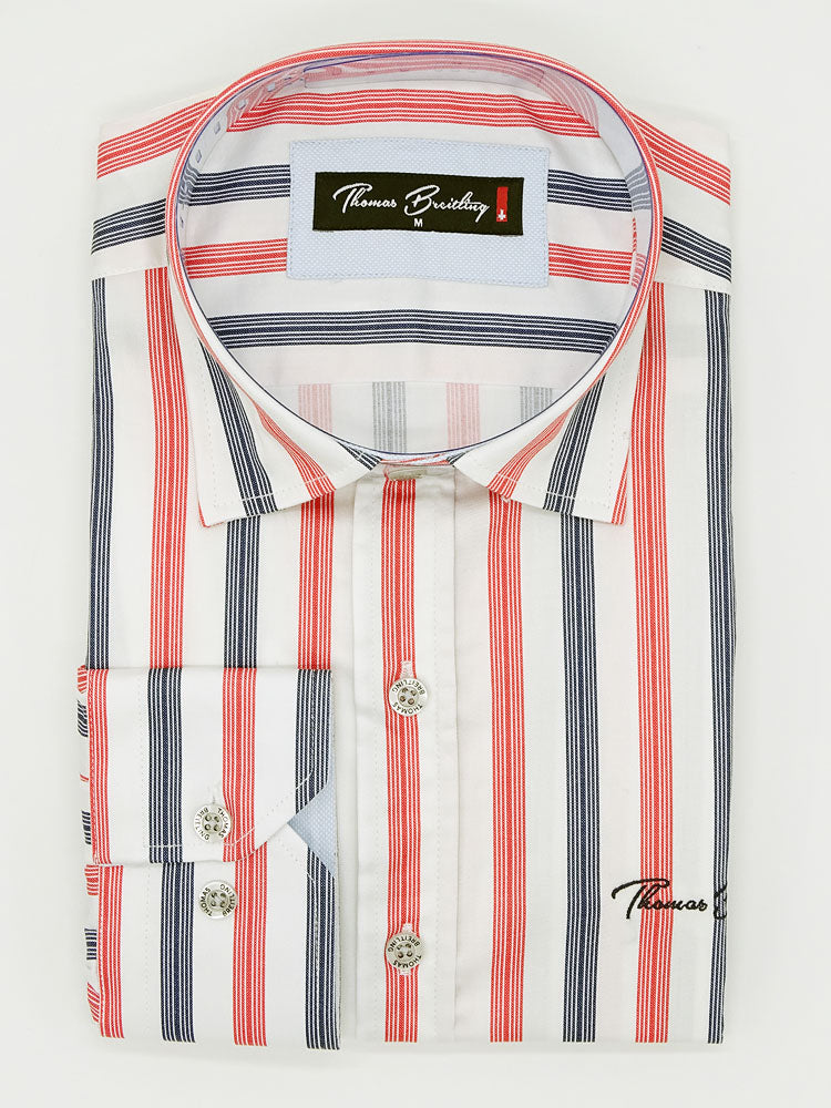 Striped men's cotton shirt with a unique pattern and contrasting inner collar. Features a button-down collar for added stability. Embroidered brand logo on the left chest. The velvety soft, durable fabric is made from high-quality cotton, offering a pleasant feel and exceptional comfort. A timeless, breathable piece that will always be a popular part of your elegant and casual style. Popular when paired with both jeans and chinos.