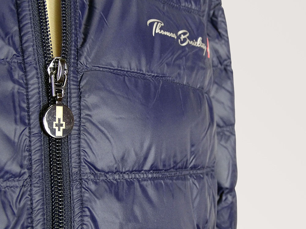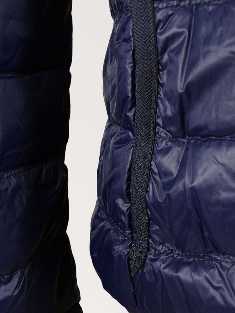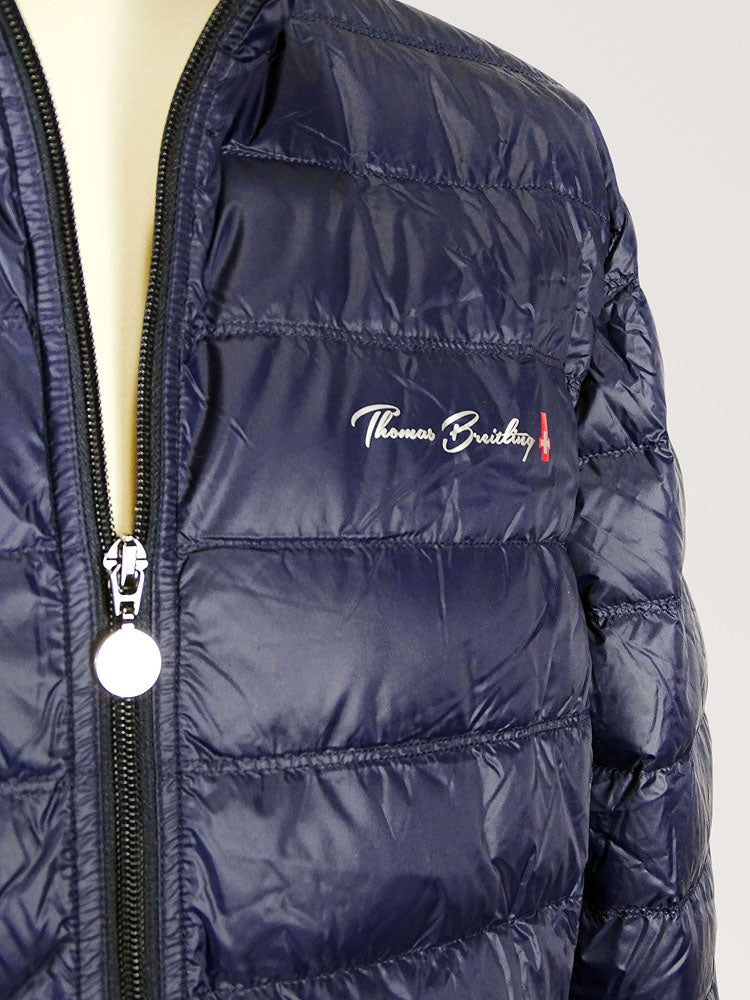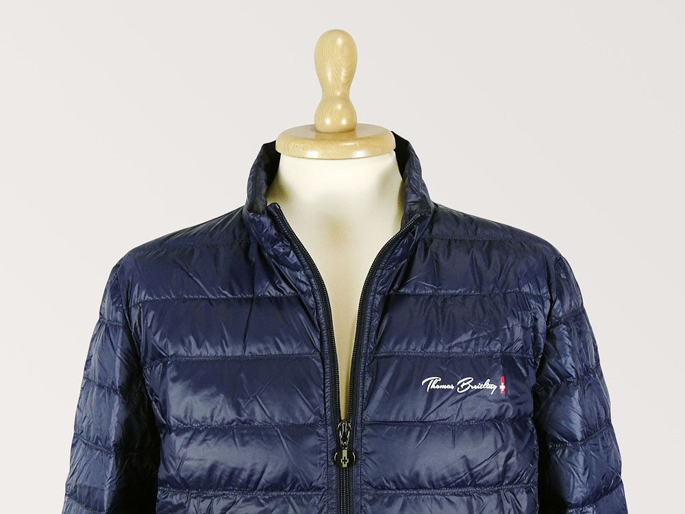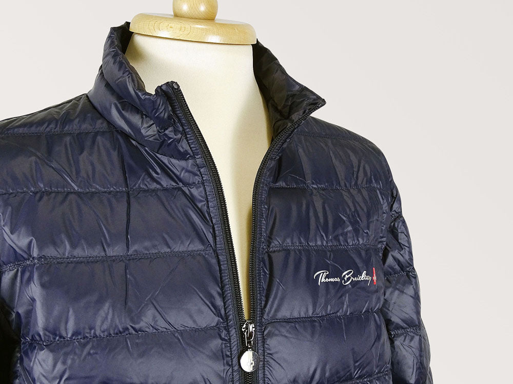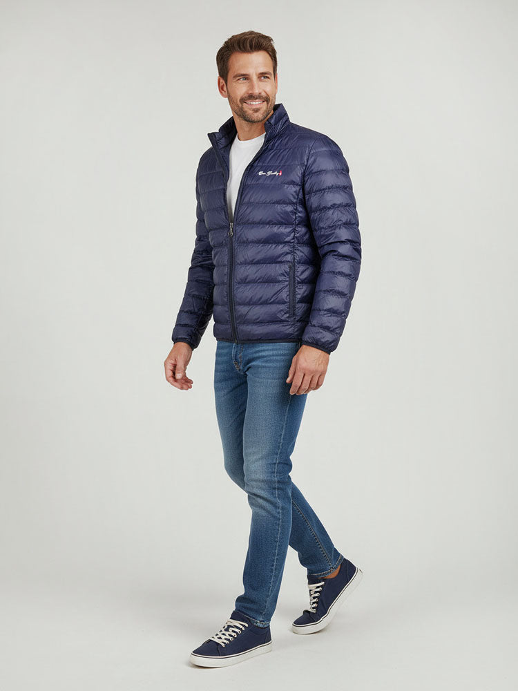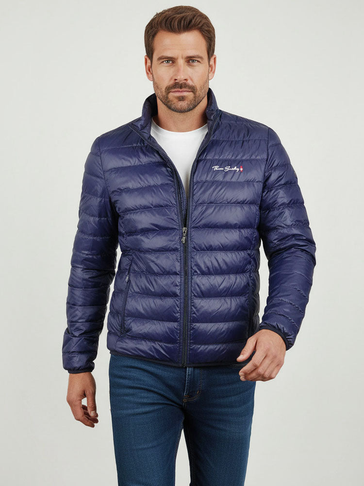 Quilted, lightweight men's autumn jacket. Straight cut with a waist, full zip closure, and side pockets. The thin and lightweight duck down lining provides good wind protection. A relaxed piece for transitional weather, whose features you will appreciate in slightly windy conditions.