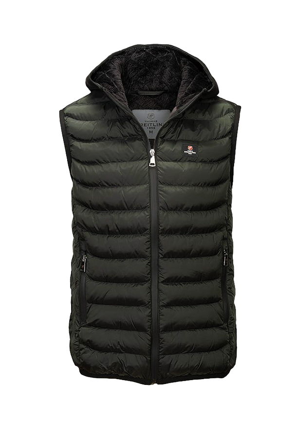 Steppelt, kapucnis férfi pufi mellény, minőségi jól szigetelő pehelytöltettel. Egyenes szabású, végig cipzárral záródó kialakítás, vékony rugalmas derék és vállrésszel. Hátul a mellény felső része kívül neoprén anyagból készült, belül műszőrrel bélelt. Cipzárral zárható elülső és belső zsebekkel, 3D Thomas Breitling logóval. A külső anyag vízlepergető és véd a hűvösebb időben. Tökéletesen illeszkedő, visszafogott és mégis stílusos darab a lezser-elegáns megjelenéshez, de sportos megjelenés esetén is megállja a helyét, amelynek prémium tulajdonságait különösen átmeneti időben fogja értékelni.