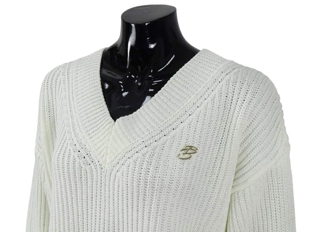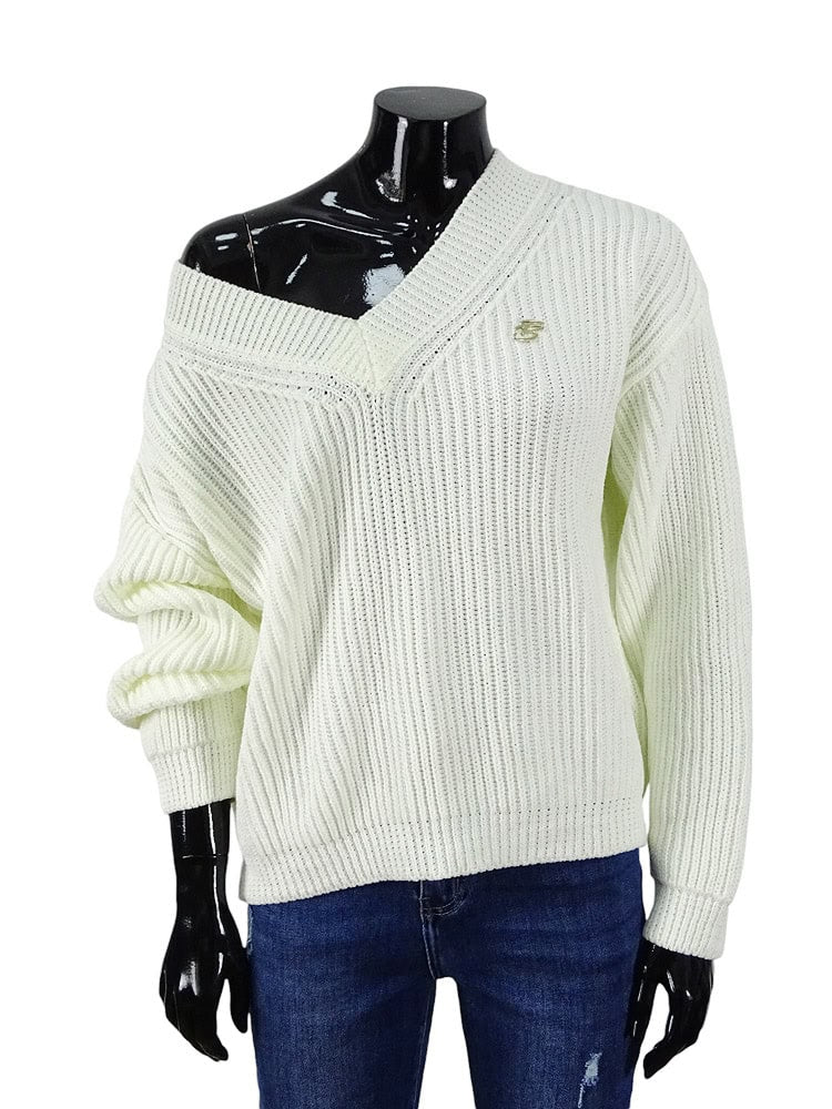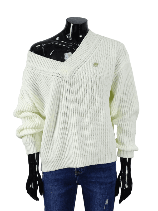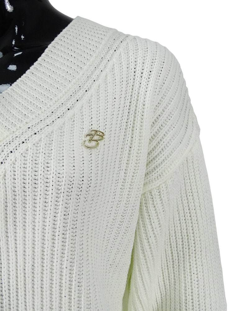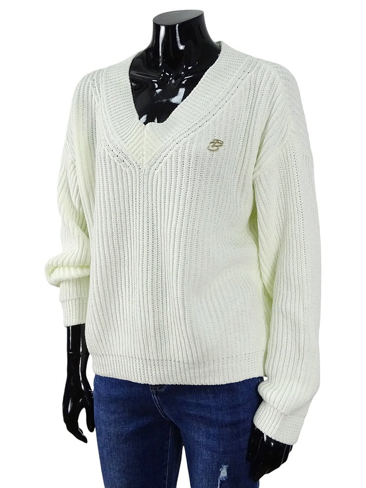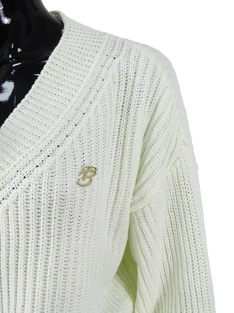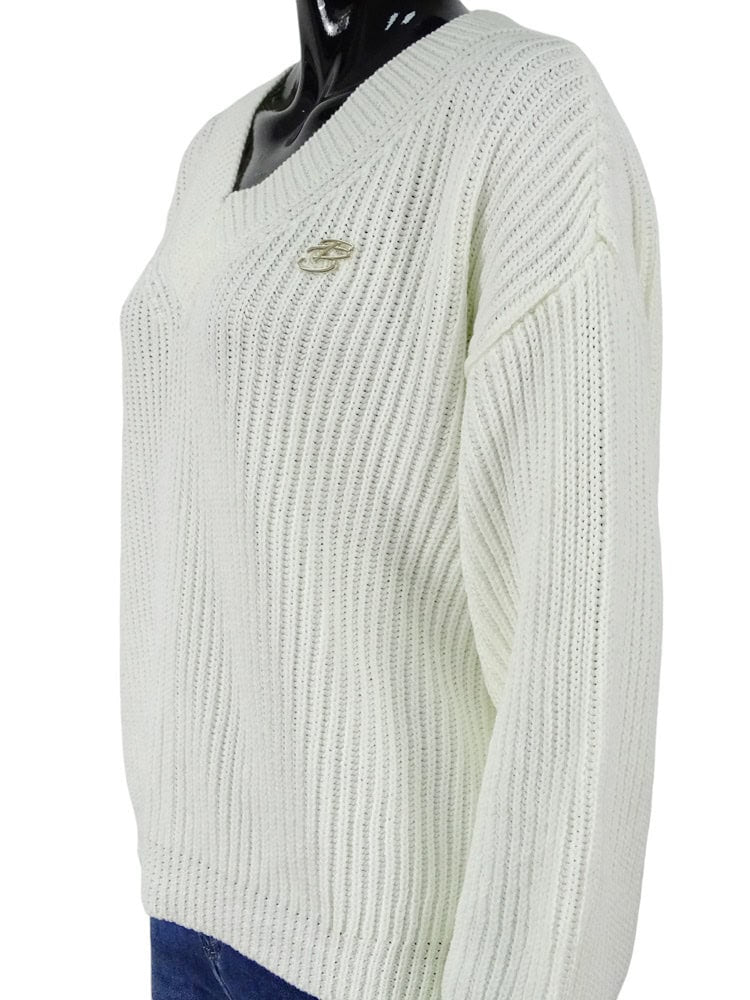Women's V-neck, long-sleeved, dropped-shoulder knit sweater. Regular fit, medium-weight knit with 3D brand logo on the chest. Its timeless elegance and versatility make it an excellent choice for mildly cool days. The high-quality material ensures comfort, thanks to the soft-touch, textured knit that is perfectly breathable and flexible. A unique piece that will always hold a special place in your wardrobe.