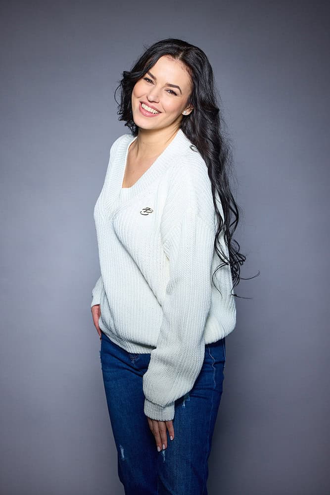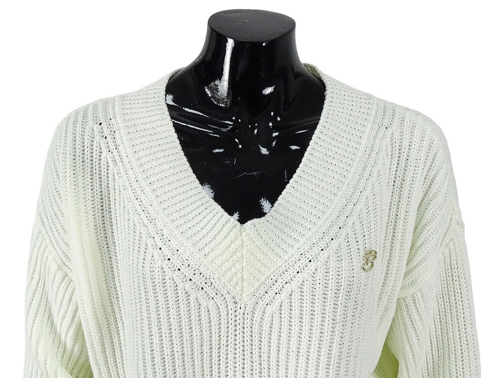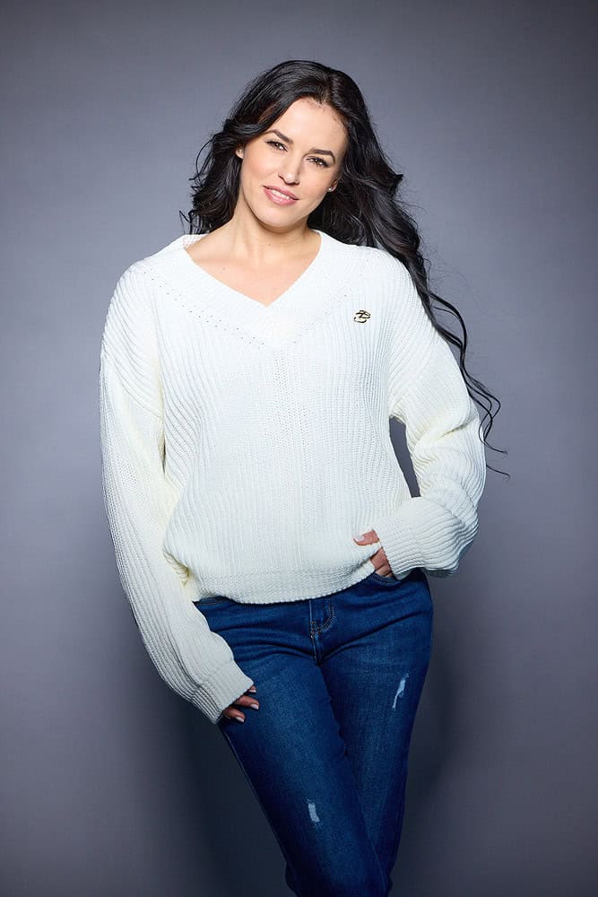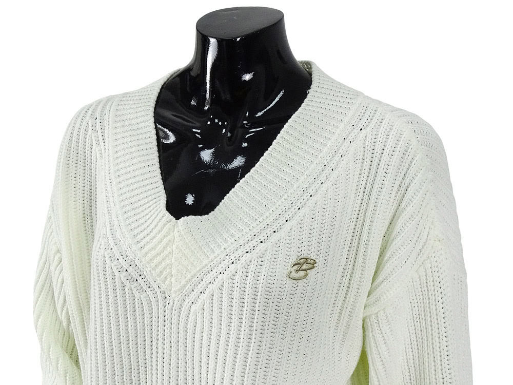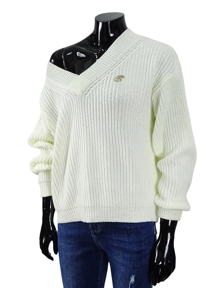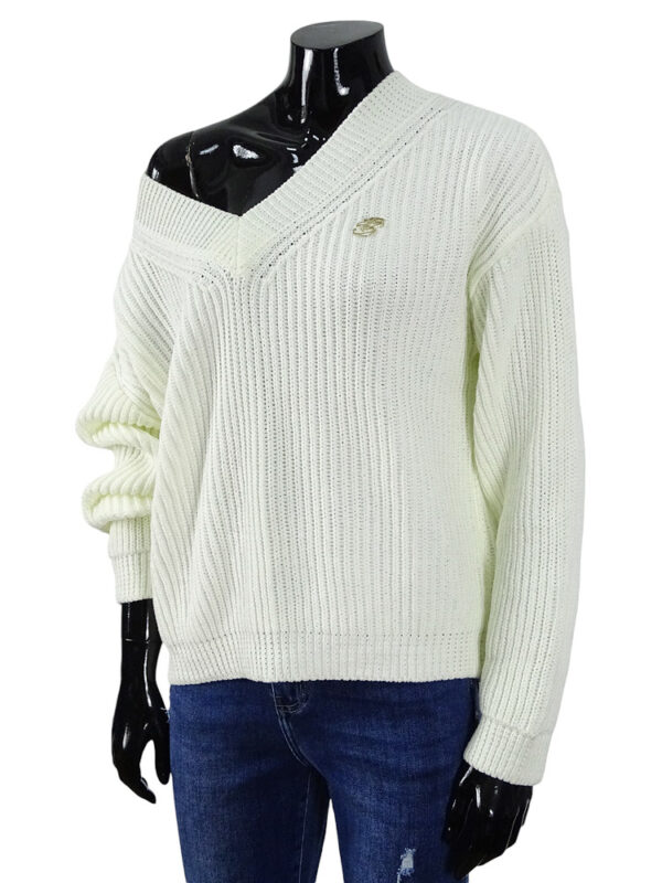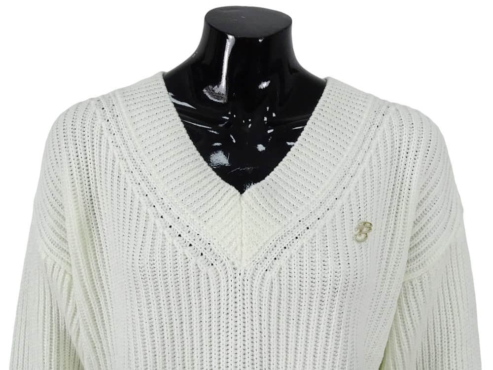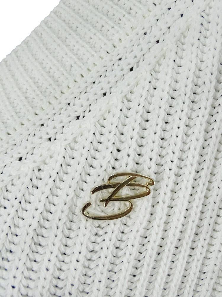 Women's V-neck, long-sleeved, dropped-shoulder knit sweater. Regular fit, medium-weight knit with 3D brand logo on the chest. Its timeless elegance and versatility make it an excellent choice for mildly cool days. The high-quality material ensures comfort, thanks to the soft-touch, textured knit that is perfectly breathable and flexible. A unique piece that will always hold a special place in your wardrobe.