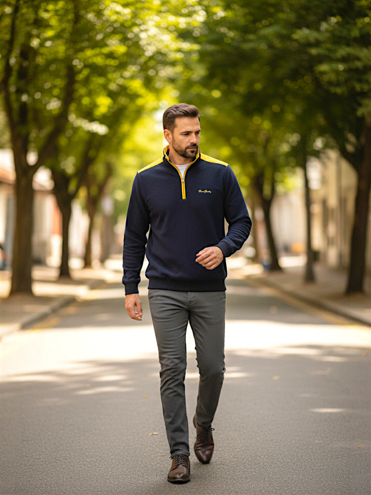 Állógalléros férfi selanik pulóver váldekorral. 1/3 cipzáras kialakítás a gallér alatt, laza esésű rugalmas szegéllyel a derékon és az ujjvégen, mely lezser-elegáns megjelenést kölcsönöz viselőjének. Írott Thomas Breitling márkajelzéssel hímezve a mellkasán, mely remekül harmonizál a pulóver színével. Egy szívünkhöz közelálló pulcsi, ugyanis a Selanik egy egyedülálló puha kötött anyag, amely finom textúrájában és különleges higiéniájában különbözik a hasonló anyagoktól. Praktikus anyag, lágysága ellenére meglehetősen sűrű, mégis formastabil. Nagyon finoman illeszkedik a testhez, ugyanakkor átengedi a levegőt, és kiváló hőszabályozást garantál. Esztétikus megjelenésű rugalmas és alacsony gyűrődésű, melynek kopásállósága kiváló. Higiénikus és hipoallergén. Jól felszívja és elpárologtatja a nedvességet. További jellemzője, kényelem és kényeztetés a használat során.