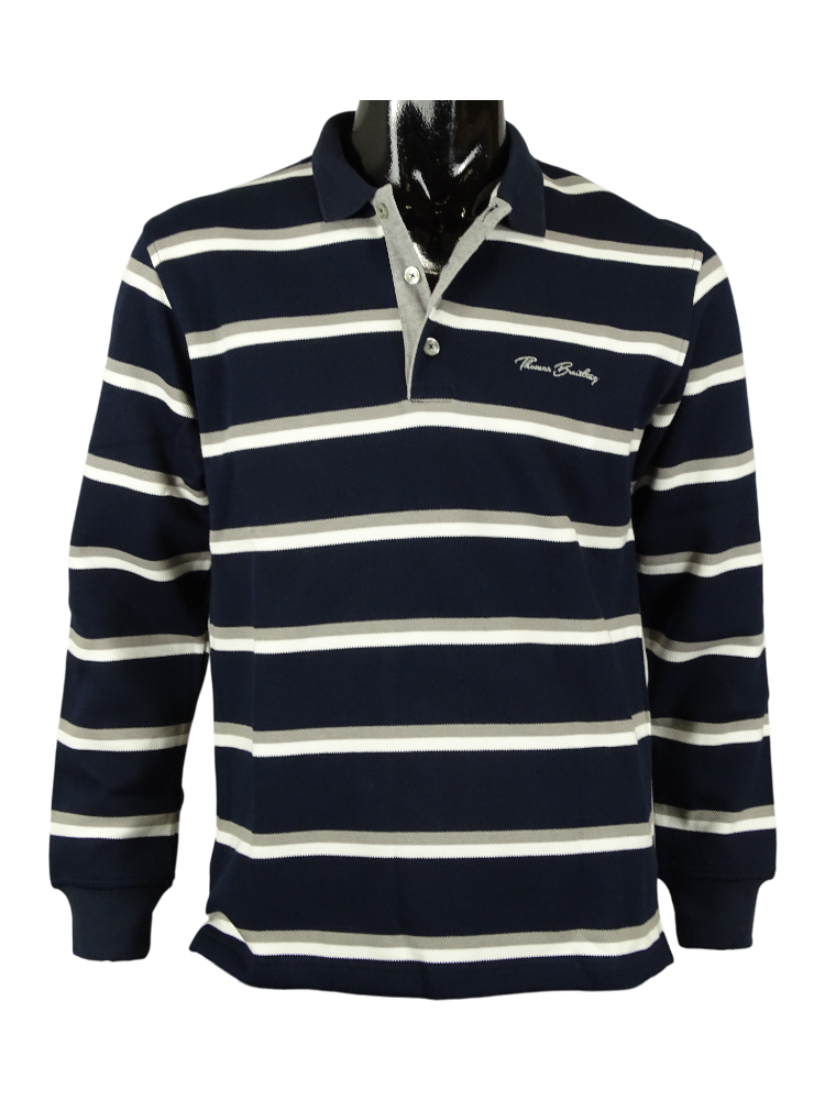 Erős óriás piké anyagból készült hosszú ujjú galléros pulcsi férfiaknak, csíkos mintával és három gombbal záródó szabással a gallér alatt. Klasszikus megjelenés, egyenes derékkal és gumis ujjszegéllyel az ujjvégen, hímzett Thomas Breitling felirattal a mellkas bal oldalán. Minőségi anyag, mely biztosítja a kényelmet, porózus textúrával, amely egyedülálló légáteresztő és nedvszívó képességet garantál. Előnye, hogy minimálisra csökken a gyűrődés esélye és megkönnyíti a karbantartást, mindezek ellenére a darab hosszú ideig megőrzi eredeti formáját és színét. Előnyös darab, ami tökéletesen kiegészíti bármelyik laza-elegáns öltözékét.