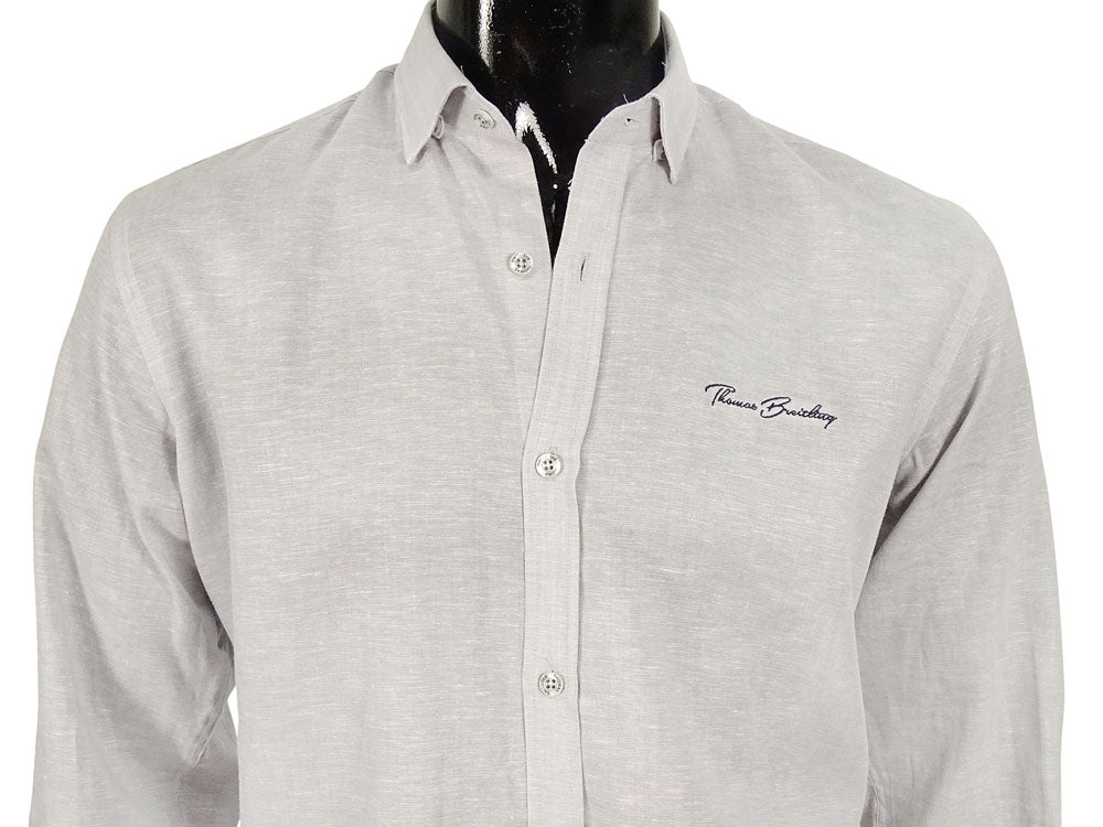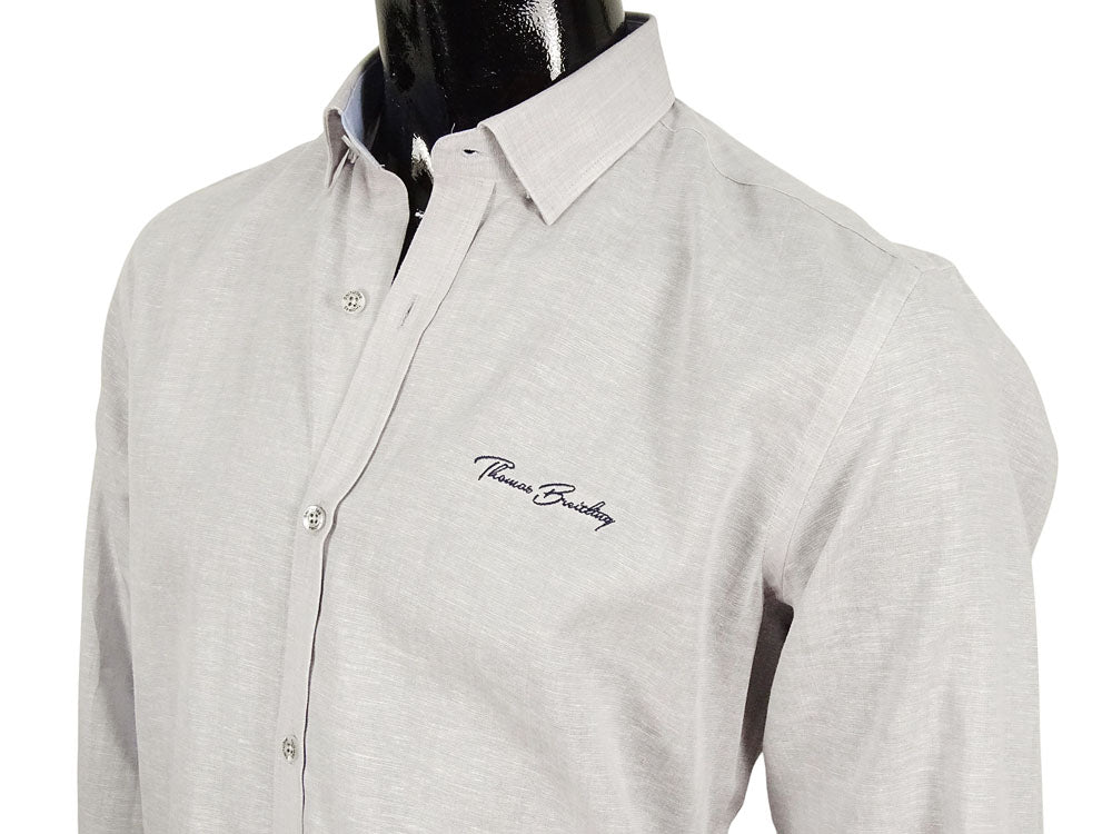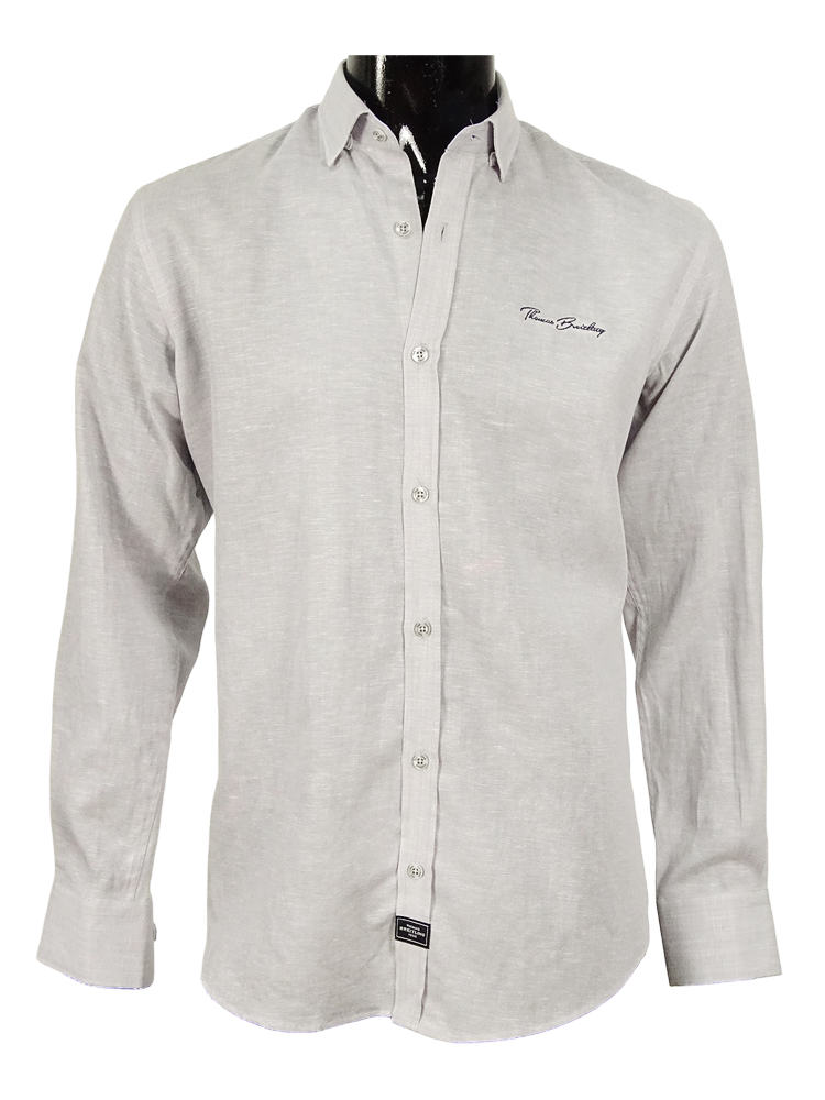 A men's long-sleeved, collared shirt in a linen-patterned, straight-cut, densely woven fabric. The breathable material provides exceptional ventilation. Features a hidden button-down collar. A Thomas Breitling brand logo is subtly placed on the left chest, harmonizing with the shirt's color. The soft, durable, breathable fabric is made from high-quality fibers and has a very pleasant feel, guaranteeing exceptional comfort during wear. A unique piece that will always hold a special place in your elegant and casual wardrobe.
