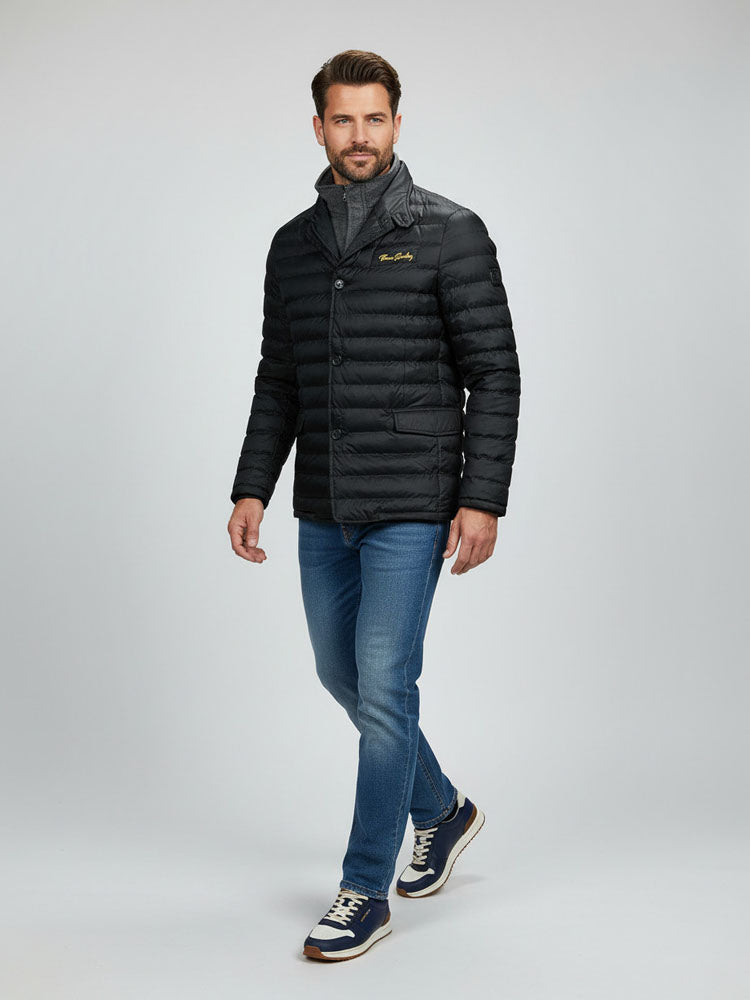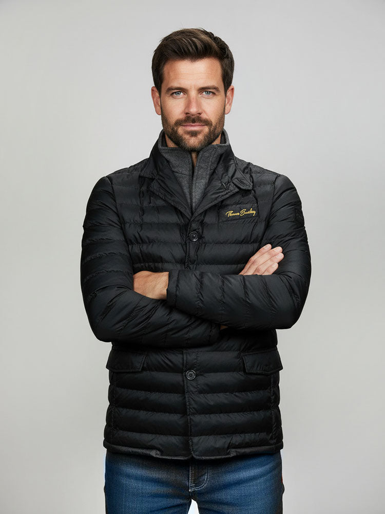 Lightweight quilted men's jacket with high-quality, well-insulating down filling. Straight cut with a snap-fastening waist for greater comfort when sitting. The jacket features a zip-out windproof lining made of a wool-polyester blend. Full button closure, slanted chest pocket with embroidered Thomas Breitling logo, front flap with snap fasteners, side zip pockets, an inside pocket, and buttoned cuffs. The blend of synthetic materials is water-resistant and windproof. A sporty-elegant staple for winter wear, whose premium qualities will be particularly appreciated in freezing temperatures.
