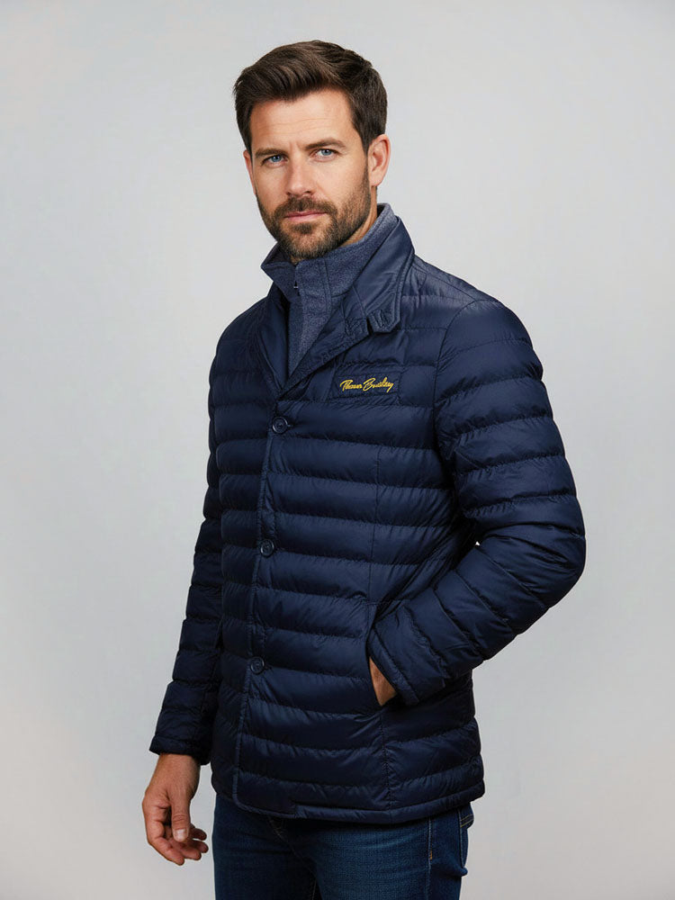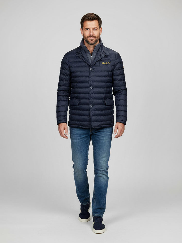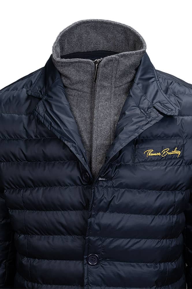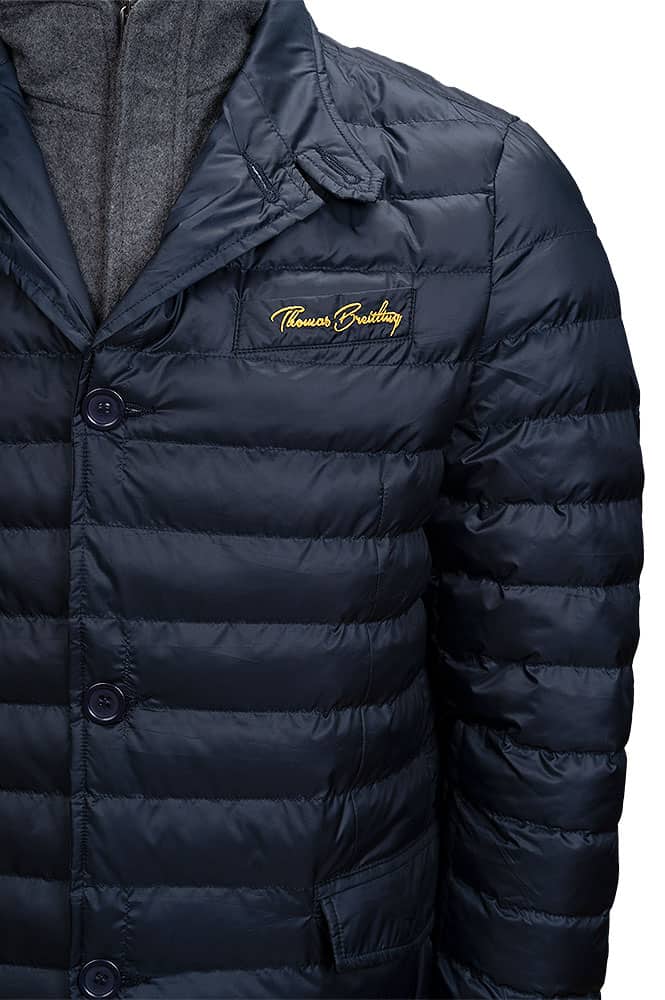 Lightweight quilted men's jacket with high-quality, well-insulating down filling. Straight cut with a snap-fastening waist for greater comfort when sitting. The jacket features a zip-out windproof lining made of a wool-polyester blend. Full button closure, slanted chest pocket with embroidered Thomas Breitling logo, front flap with snap fasteners, side zip pockets, an inside pocket, and buttoned cuffs. The blend of synthetic materials is water-resistant and windproof. A sporty-elegant staple for winter wear, whose premium qualities will be particularly appreciated in freezing temperatures.