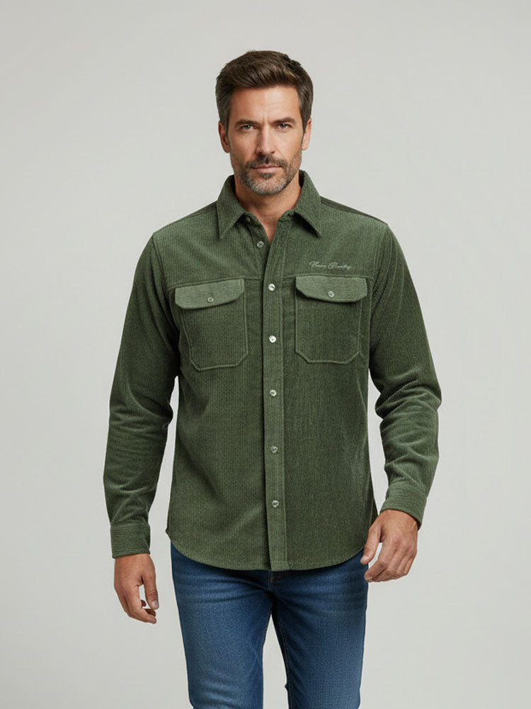 Egyszínű anyagában bordázott mintás, hosszúujjú egyenes szabású férfi kordbársony ing, kényelmes ujjakkal, belül eltérő színű passzéval. Végig patentos szabás, elöl lepatentolható-, oldalt nyitott zsebekkel valamint hímzett márkajelzéssel a mellkas bal oldalán. Egyedi mintájával, népszerű részét képezi majd elegáns és lezser ruhatárának. Nagyszerű viselet farmer nadrággal.