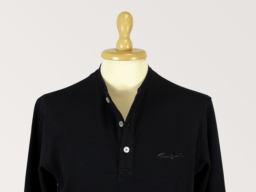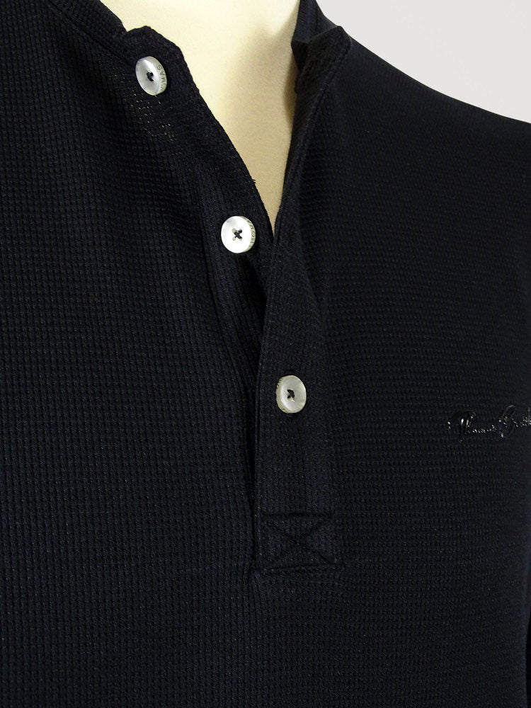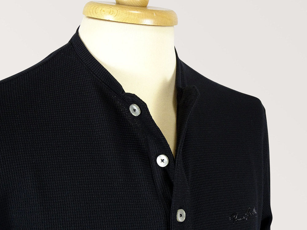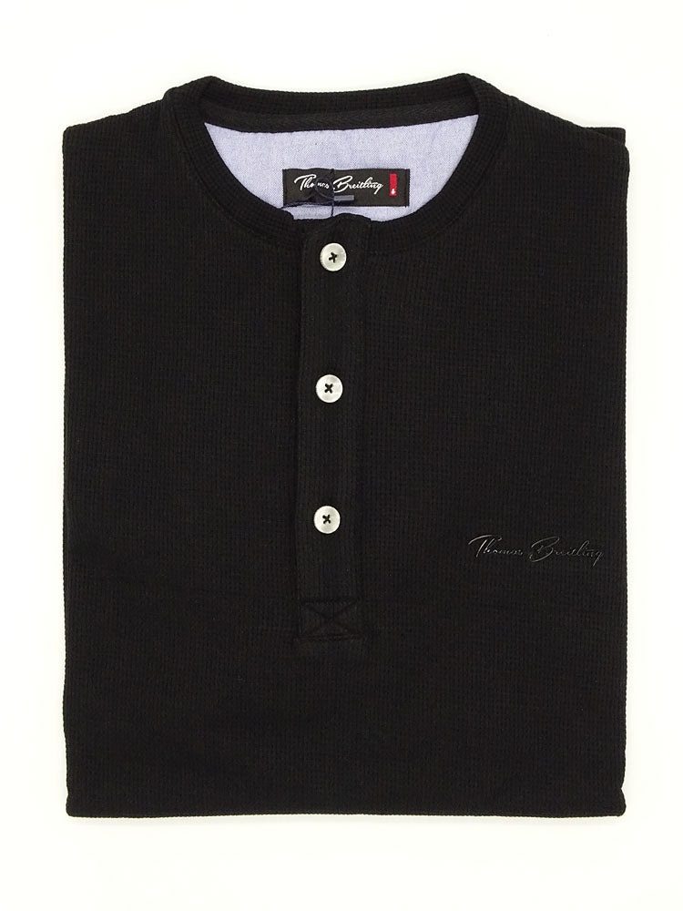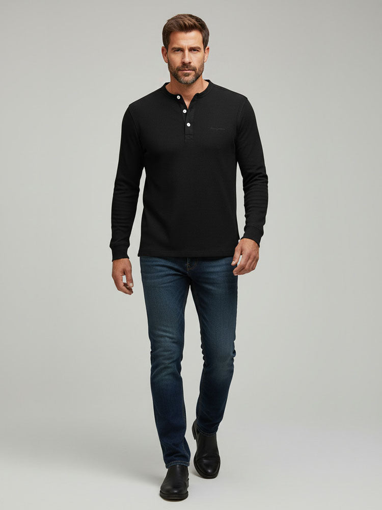 Erős, anyagában textúrált hosszú ujjú kevertszálas pamut pulóver férfiaknak. Laza-elegáns megjelenés, 3 gombos, o-nyakú kialakítás. Egyenes esésű felső, egyenes szabással a derék részen és gumis szegéllyel az újjvégen. Az anyagöszetétel miatt, kiváló nedvszívó képességgel rendelkezik, hűvösebb időben is kiválóan szigetel. Lazán illeszkedő, visszafogott darab a lezser stílusú megjelenéshez.