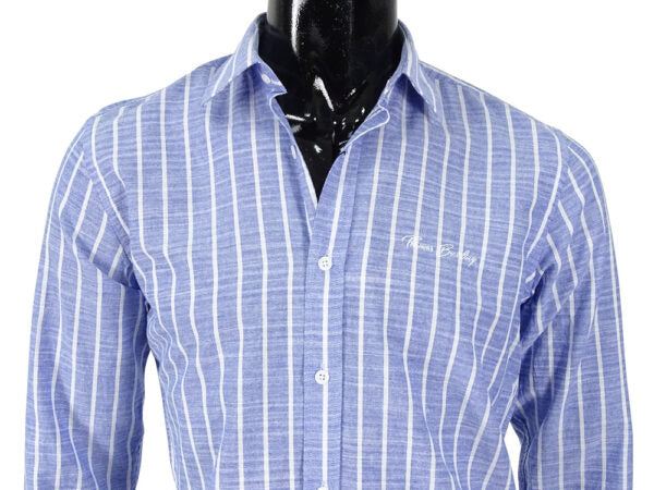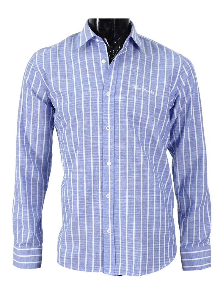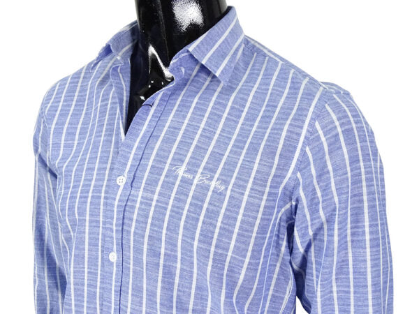 Keskeny csíkos férfi pamut-len ing, kényelmes ujjakkal és belül azonos színű passzéval. Erős gallérral, amely biztosítja a gallér stabilitását. Hímzett márkajelzéssel a mellkas bal oldalán. A bársonyosan puha, tartós, len hatású anyag kiváló minőségű pamutszálból készült és nagyon kellemes tapintású, rendkívül kényelmes érzést garantál viselés közben. Időtálló, amely mindig népszerű részét képezi majd elegáns és lezser stílusának. Népszerű viselet farmer nadrággal és chino nadrággal kombinálva egyaránt.