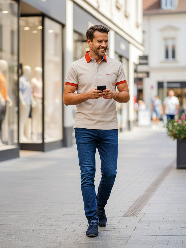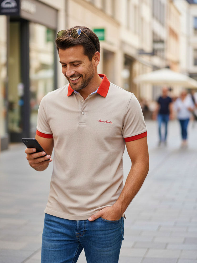 Galléros 3 gombos rövidujjú férfi piké póló eltérő színű gallérral (bézs)