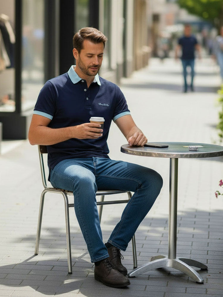 Galléros 3 gombos rövidujjú férfi piké póló eltérő színű gallérral (s.kék)